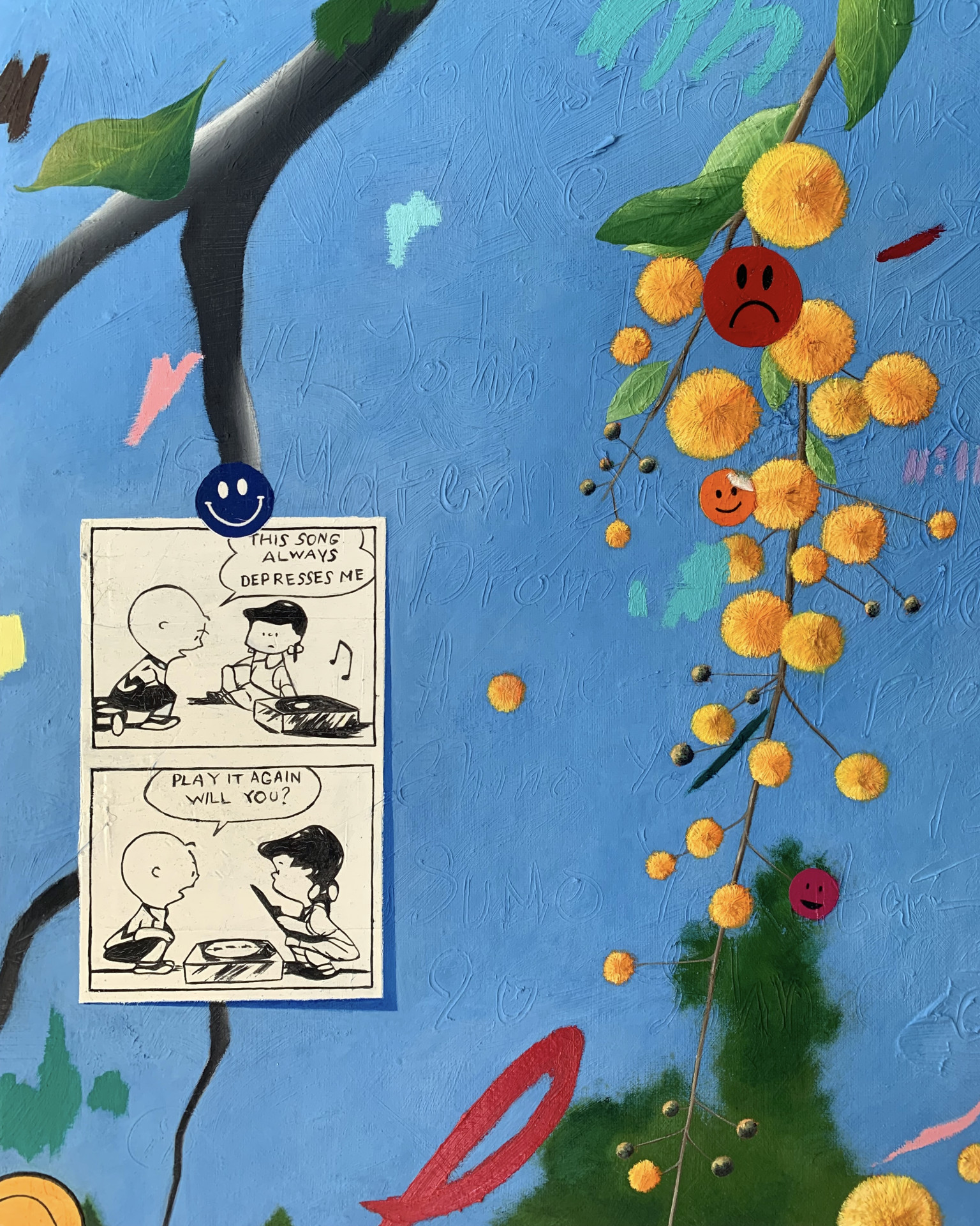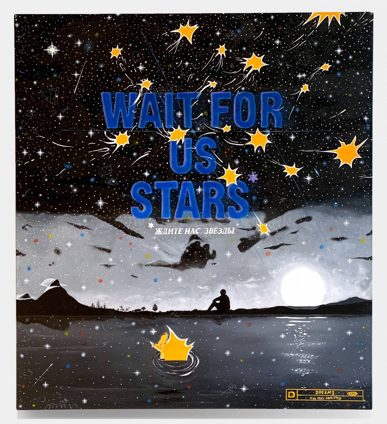 На первый взгляд работы Сахацкого поражают яркостью красок, резкими контрастами и узнаваемыми образами. Картина No fun, no future, just… (2023) с пылающим закатом и надписью Just tired перекликается с эстетикой социальных сетей, где романтизированная меланхолия давно стала частью визуального языка. В других работах появляются персонажи массовой культуры — иногда в непривычных, почти уязвимых состояниях. Кажется, что сами картины слегка иронизируют над собственными эмоциями, удерживая баланс между шуткой и настоящим переживанием.