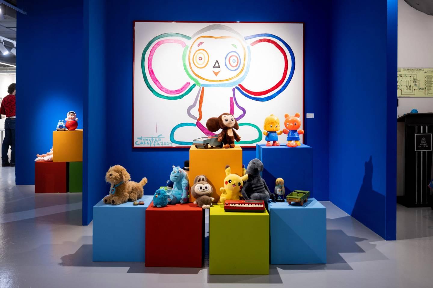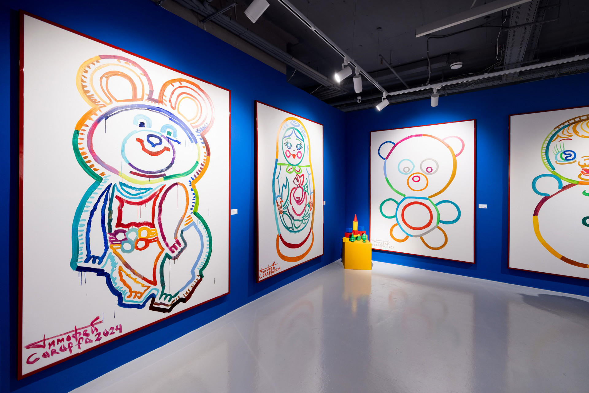 Выставка также включает уникальный арт-объект художника Глеба Ольховика — инсталляцию с игрушками разных поколений. Этот объект становится важной частью экспозиции, символизируя преемственность детских радостей и воспоминаний, которые связывают прошлое и настоящее. Игрушки, собранные из разных эпох, представляют собой живой мост между поколениями, отражая изменение восприятия мира ребенком в разные исторические периоды. Такое включение подчеркивает главную идею выставки — детство как универсальный и вечный источник творческой энергии и искренних эмоций. Арт-объект с игрушками становится пространством для игры и размышления, объединяя визуальное искусство Тимофея Караффа-Корбут с материальной культурой детства, расширяя концепцию «наивного» взгляда на мир и добавляя в нее элемент истории и семейной памяти. Этот элемент экспозиции позволяет зрителю окунуться в атмосферу детства не только через образное представление художника, но и через физическое взаимодействие с предметами, знакомыми многим с раннего возраста, создавая диалог между поколениями и напоминая о ценности простых радостей и творческой непосредственности.
