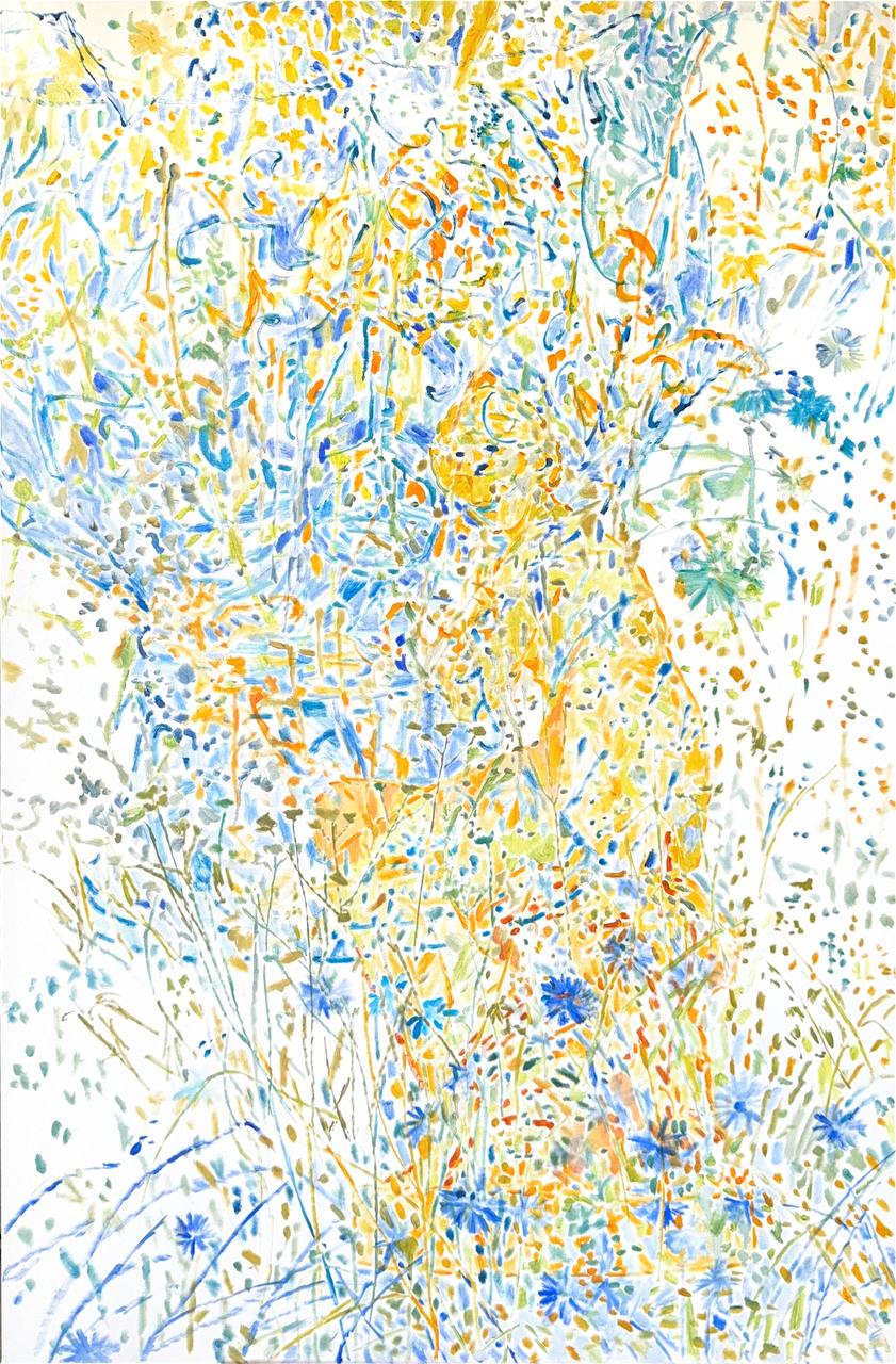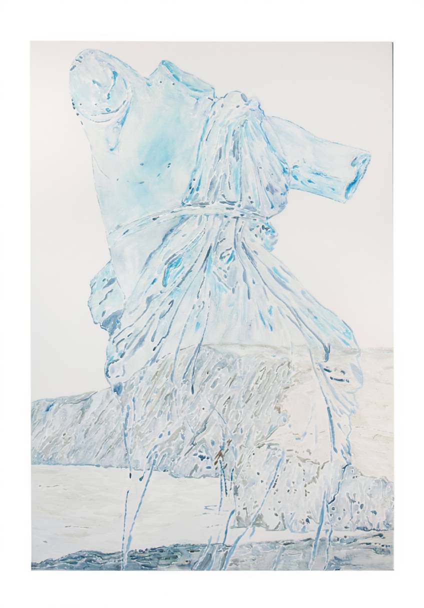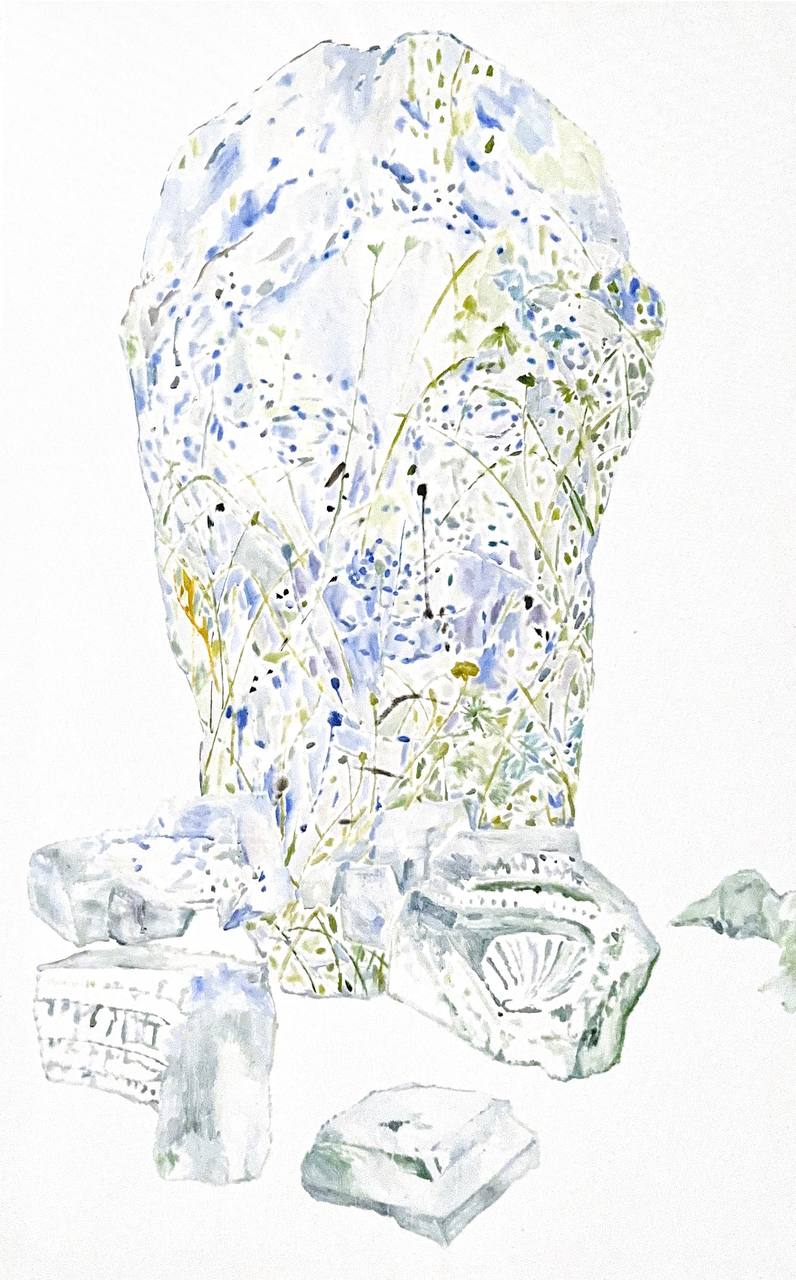 Архитектурные фрагменты выступают как реликты культурной памяти. Ландшафт представляется своего рода витриной, в которой разные объекты культуры сохранены артефактами. Однако они лишены своей монументальной замкнутости: их материальность подрывается живописной тканью. Голубая, почти водная палитра растворяет плотность формы, объекты распадаются, проникая сквозь пейзаж. Травы, колючие кустарники, дикая ежевика, вьюнки и чертополох не просто обрамляют объект, но буквально инфильтрируют его структуру. Возникает эффект пористости: форма становится проницаемой.