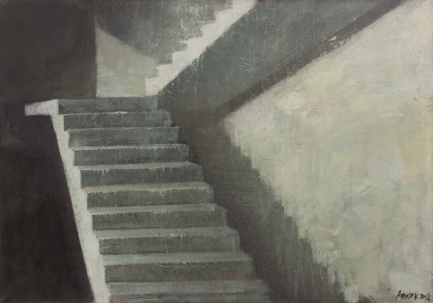 Для Агроскина лестница становится универсальным языком, на котором говорят о самом главном: о движении, цели и самом процессе пути. В его работах ступени часто лишены начала или конца, уходя в бесконечность или обрываясь в пустоте. Это визуальная метафора процесса познания, где каждая новая ступень — это обретённое знание, которое одновременно является и новой загадкой. Художник предлагает задуматься: есть ли вершина у познания, или сам путь и есть цель?
