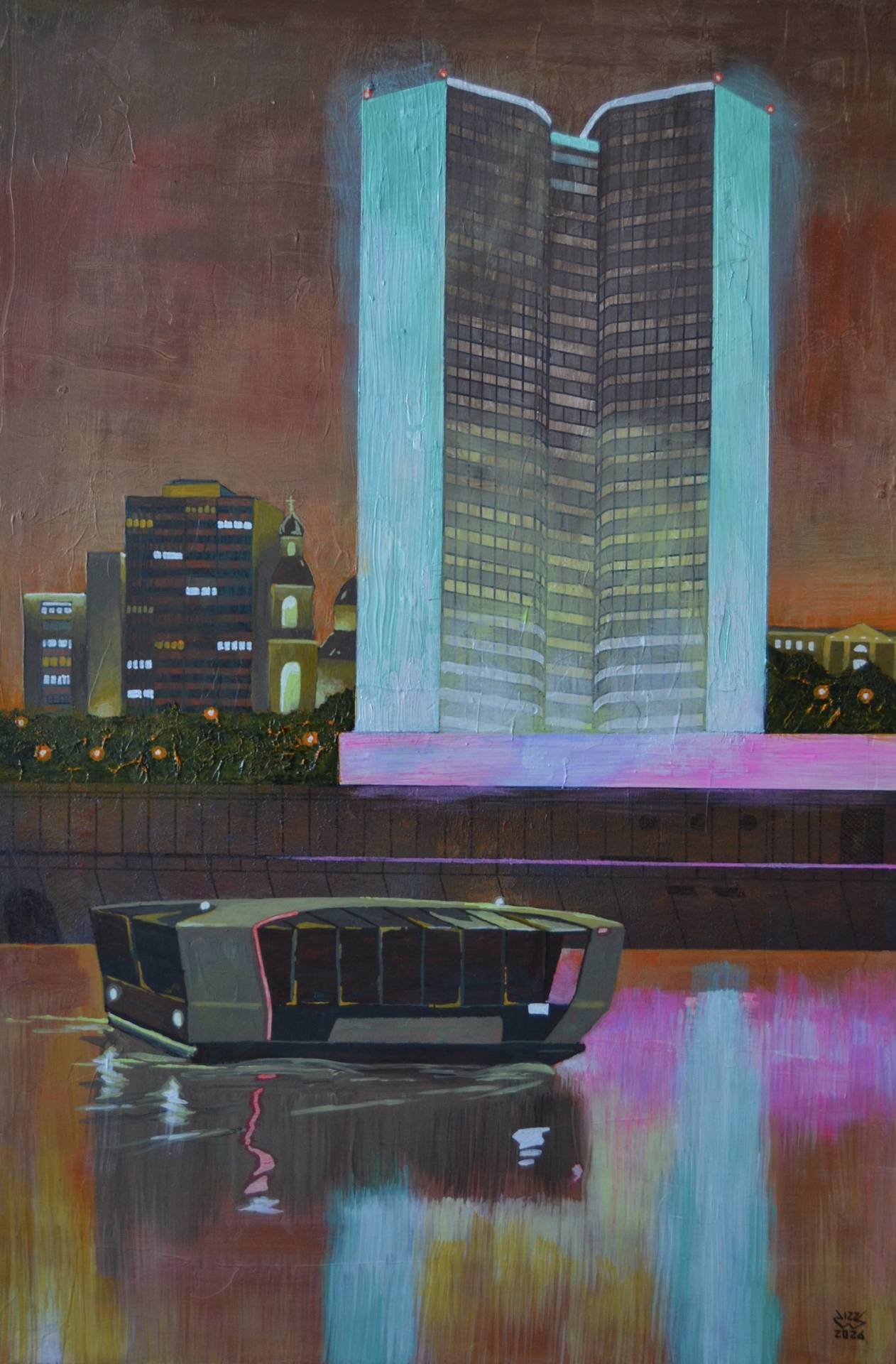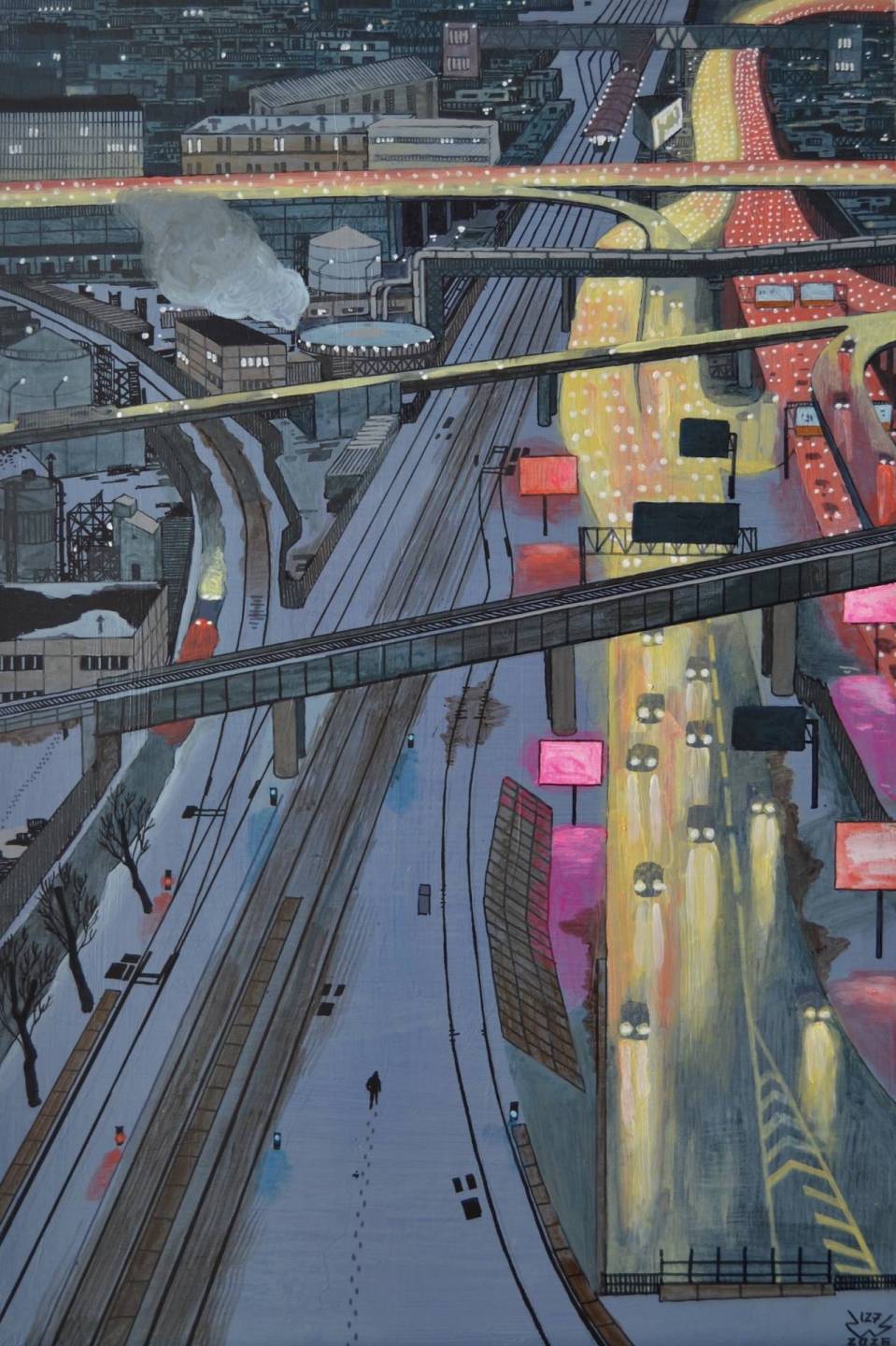 Сергей Вэ окончил МГАХИ им. Сурикова по специальности «станковая графика» в 2021 году и работает как художник-монументалист. В галерее ЛУЧ представлены работы в технике живописи на холсте и МДФ, его знаковые мозаики с новыми сюжетами и витраж с подсветкой. В этот раз центре внимания художника — город, экраны и освещение, искусственные источники света и отражения. Вся экспозиция объединена эстетикой киберпанка, в которой он часто работает.