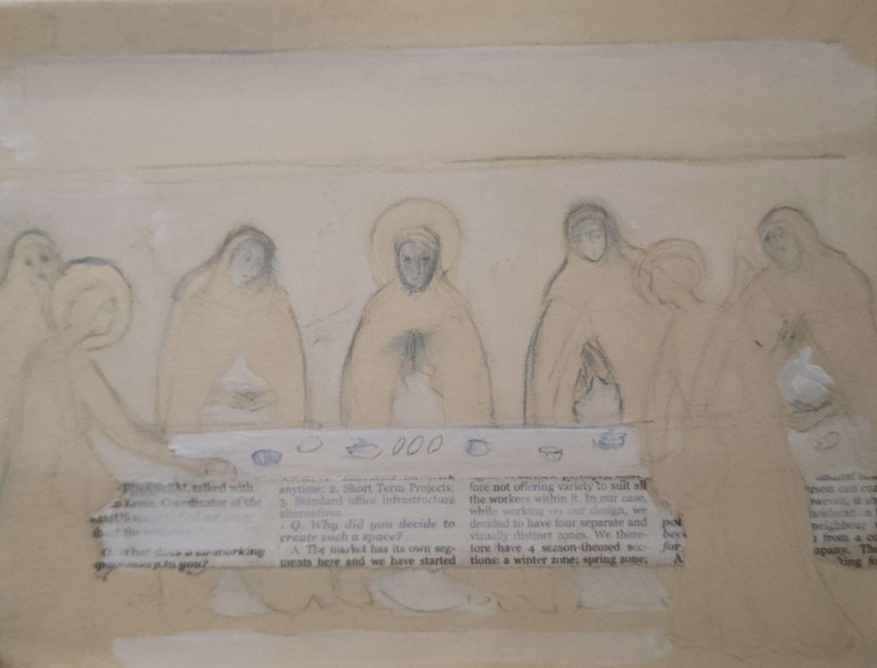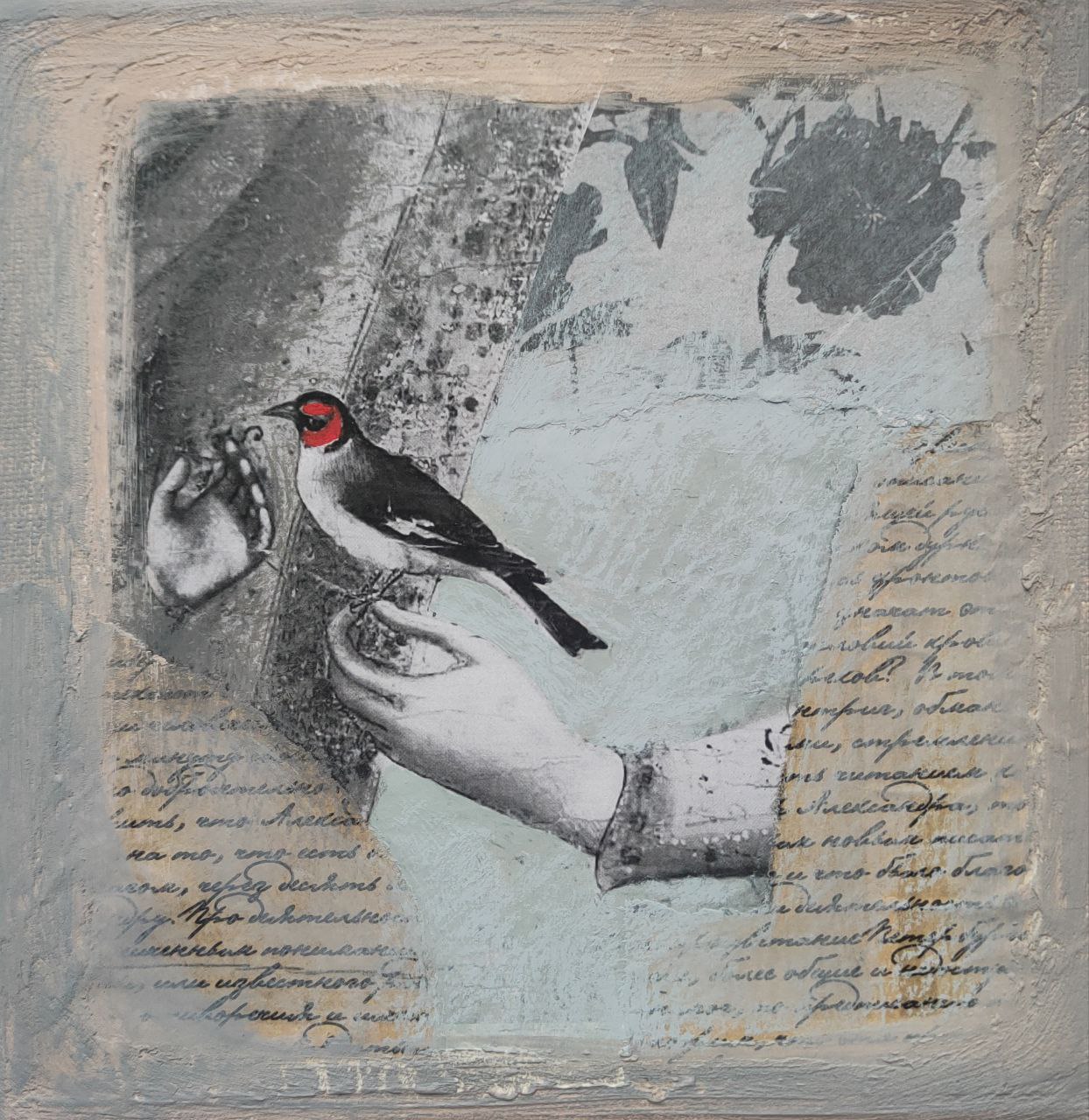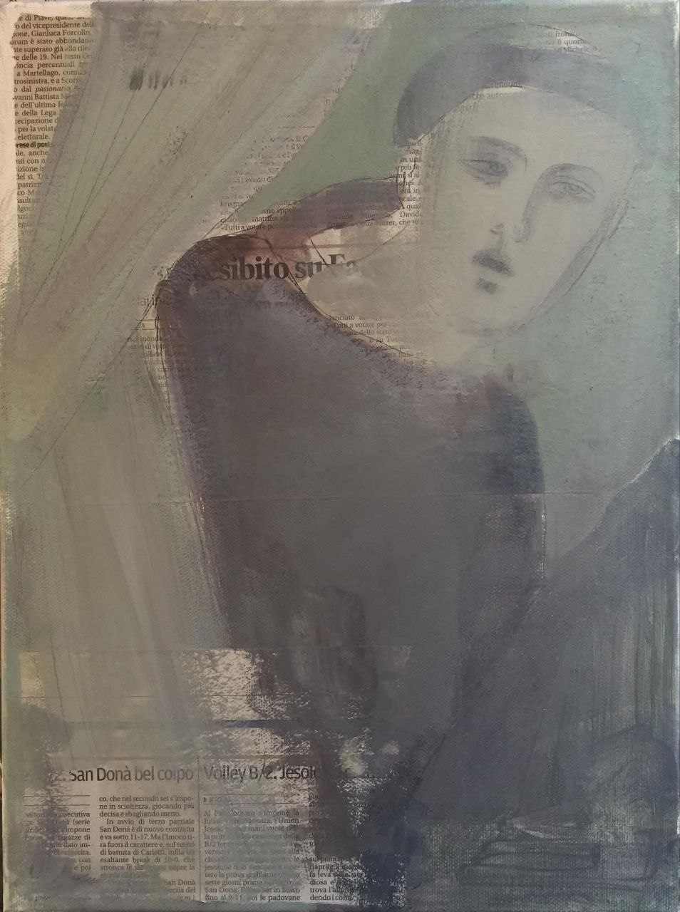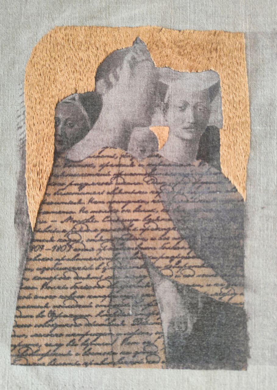 Обратная сторона этой работы с памятью (или с тенями памяти) — в коллажах, вышивках и «малой графике». Внятный ассоциативный ряд — история искусства, чьи экспонаты в каком-то смысле давно пребывают не вполне в статусе вещей: они «по закону» принадлежит вечности и, собственно, являются ею. Но их фрагменты или даже просто имена авторов могут сделаться личными «секретиками» (эта детская игра тут тоже вспоминается) — посредством их перевода в иной регистр и на иной язык. В визуальных воспоминаниях о картинах Пьеро делла Франческа, Рогира ван дер Вейдена или Джованни Беллини исходная живопись словно бы растворяется — то в откровенном «истаивании» и развеществлении былой фигуративности, то в пустотах изобразительной ткани, прочитываемых как утраты связной памяти или ее сознательное «запечатывание», то в палимпсестном напластовании фактур, где почти нечитаемые знаки письма вторгаются в изображение. Здесь присутствует сложно рефлексируемое переживание времени – и времени в разрыве «вечное-сиюминутное» (когда, например, разноязыкие газетные тексты включены в «омаж»), и времени, напротив, стремящегося стать единым в самой длительности вышивания евангельских текстов.