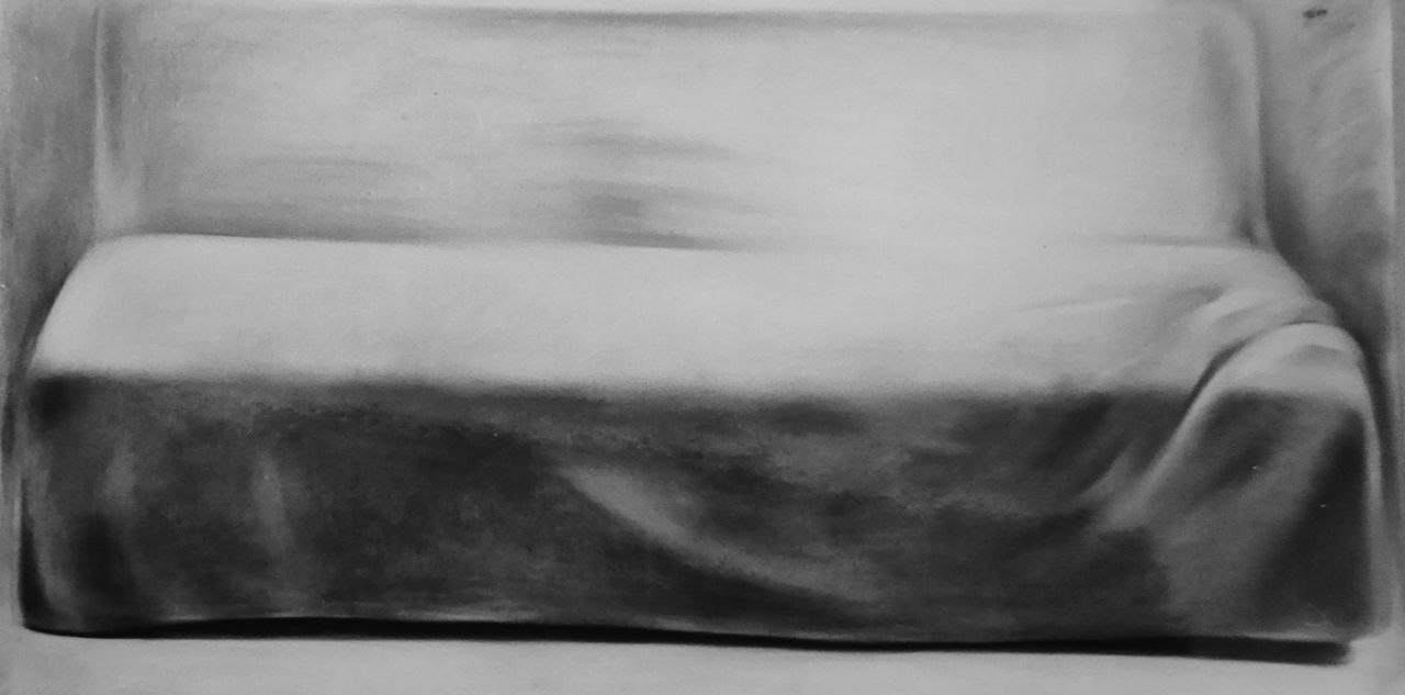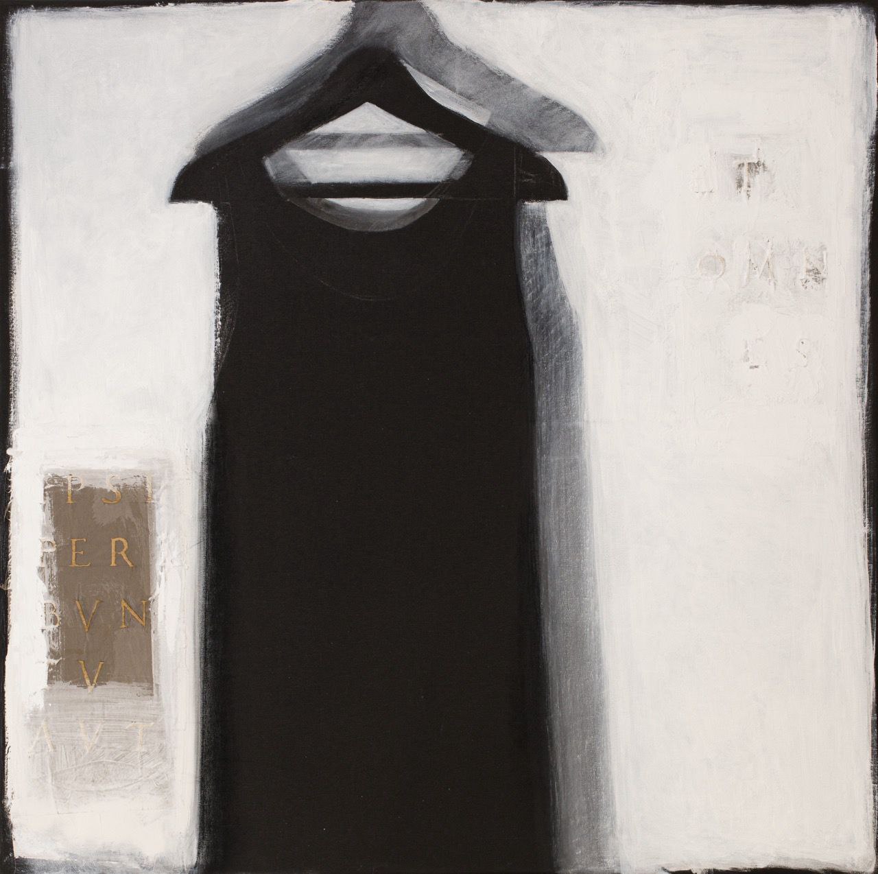 Часто (не всегда, но часто) это пастели. Техника, которая генетически адресует к миниатюре — летучая пыльца, едва способная удержать память, — а здесь метровые квадраты, и летучесть запечатана толстым стеклом. Там, под стеклом, как в музейной витрине, в дистиллированном и переливчатом сумраке живут ничьи уже вещи — висят на вешалках с инвентарными бирками (то есть введение текста с простой, вероятно, целью разнообразить фактуры порой прочитывается как значимый жест пояснения, экспликации). Они отбрасывают тени, которые тоже важны: тень есть некая отсылка к материальной «телесности» самого предмета — будучи выключен из бытовых контекстов, он остается в памяти как целое. Когда же такой контекст вроде бы подразумевается — например, шкаф стоит в комнате — то пространство этой комнаты перестает быть рассчитанным на естественные движения: оно превращается в гадательную, несколько сновидческую среду, — шкаф не то чтобы стоит, он стоял когда-то, а теперь вспоминается как смутный образ.
