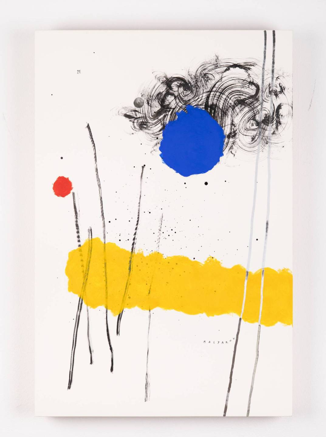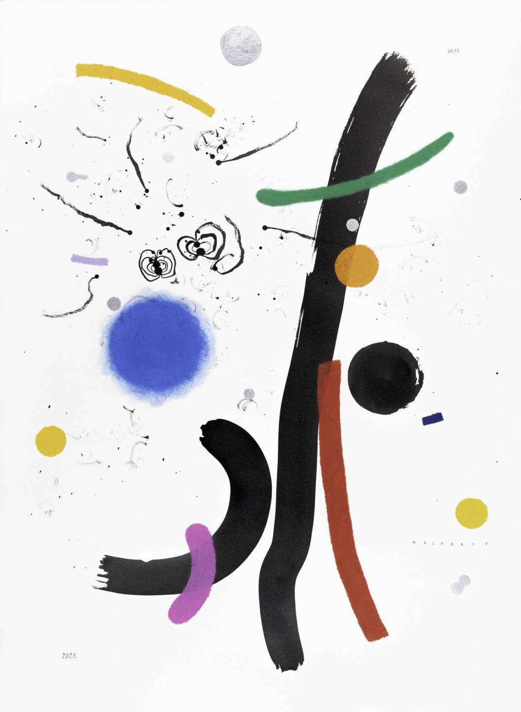 Тимофей Маляров создает абстрактные графические произведения. Они строятся на взаимодействии цветовых плоскостей, линий и ритмов. Художника интересует не сюжет, а возможность создать гармонию на листе бумаги. Собрать такую комбинацию элементов, чтобы изображение было живым, а не статичным. В работах Малярова отсутствует заданный смысловой «ключ» — он предлагает позволить чувствам выйти на первый план.